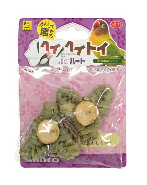 木のボタンがワンポイント、つついてほぐして気になる小鳥用おもちゃです!ヘイヘイトイ ハート2個パック 三晃商会
